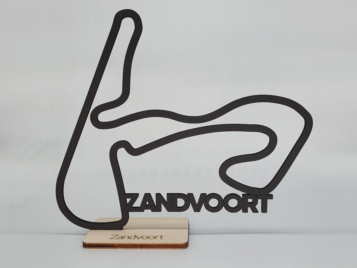 Uit hout gesneden het circuit Zandvoort. In zwart op naturel blokje.