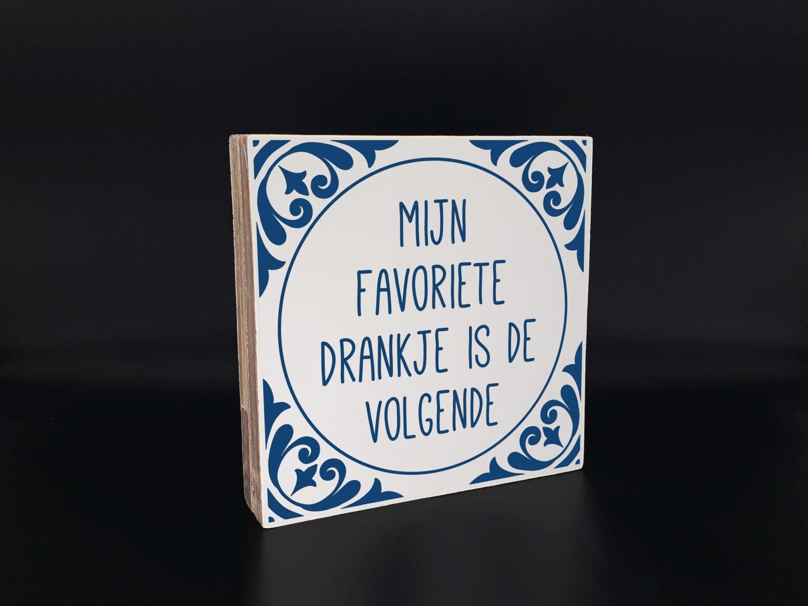 Wit met blauwe opdruk. "Favoriete drankje is de volgende". Afmeting 18 x18 x 3,5 cm.