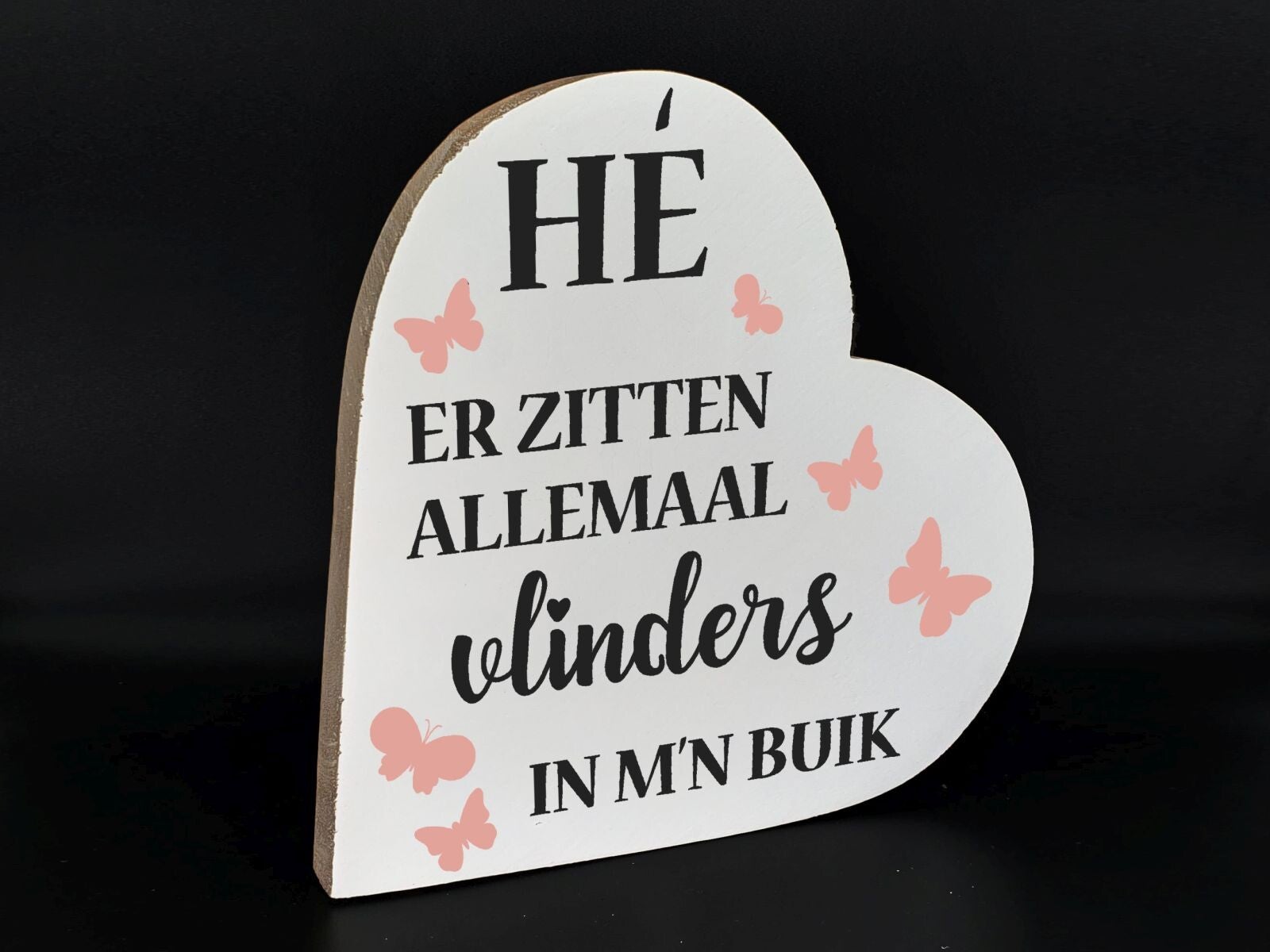 Wit met zwart en roze opdruk. "Hé vlinders in mijn buik". Afmeting