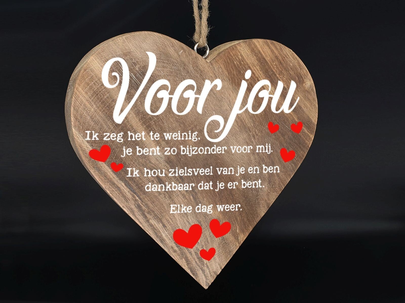 Houten hart, naturel met witte tekst en rode harten. "Voor jou...". Afmeting